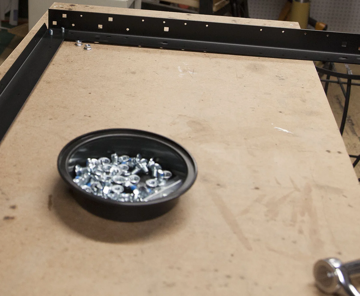 Use a framing square to make sure the legs are square and tighten all the bolts.